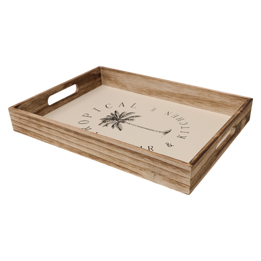 The brown wooden serving tray measuring 26x36x4.7 cm is a functional and elegant accessory for any home or hospitality environment. Made from durable wood, it offers stability and resistance to daily use. The warm brown color and natural texture give it a classic and refined look, suitable for use both in the kitchen and outdoors. With its generous size, this tray is ideal for serving drinks, food or desserts.
