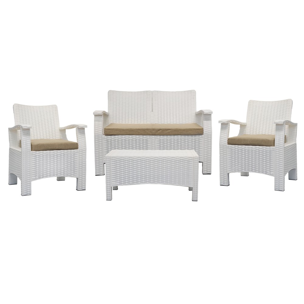 1. **Material and color:** The furniture is made of plastic rattan suitable for outdoor use and is in a combination of white and beige colors, creating a clean and attractive look.