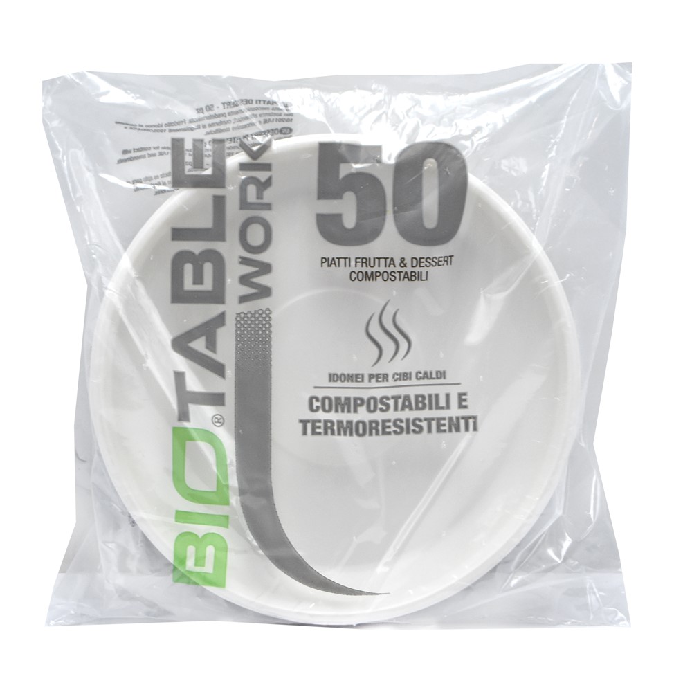 Disposable plate for desserts, made of biopolymer material, with a diameter of 16 cm, in white color. The component material is biologically degradable, has no toxic or harmful content and is hygienic to use. It is used to serve different desserts. The package contains 50 plates.
