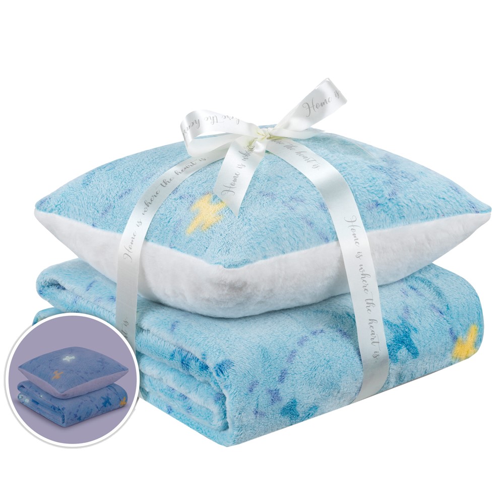 Blanket and pillow set for children, made of soft polyester microfiber material, in different colors, with phosphorescent star design, which glow in the dark. The set includes a blanket, with dimensions of 190x130 cm and a cushion with microfiber padding, with dimensions of 37x37 cm. This set is suitable for daily use and can be used as a gift for children. It can be washed in the washing machine at a temperature of 30 °.