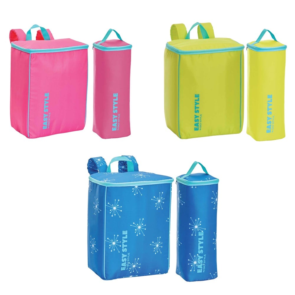Set of lunch bag, which contains a large lunch bag, with dimensions of 26.7x17x35 cm and capacity of 15 liters, and a thermal bottle, with dimensions of 10x10x35.5 cm and a capacity of 2 liters. The bag is equipped with two comfortable adjustable shoulder straps for easy transport. It can be used for packing and carrying various foods and it maintains food temperature for a long time.