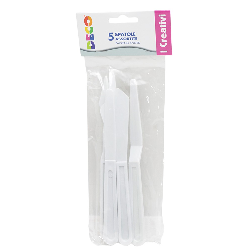 Pack of 5 spatulas made of resistant acrylic material which makes them light and flexible. Ideal for applying color to canvases. Maximum length 20 cm.