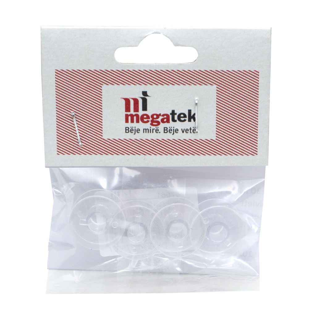 Sewing machine bobbins, made of durable plastic material, with dimensions of 2 cm in diameter, in transparent color. The bobbins are used to place the thread on sewing machines. The package contains 4 bobbins. This product is suitable for professional and non-professional use.