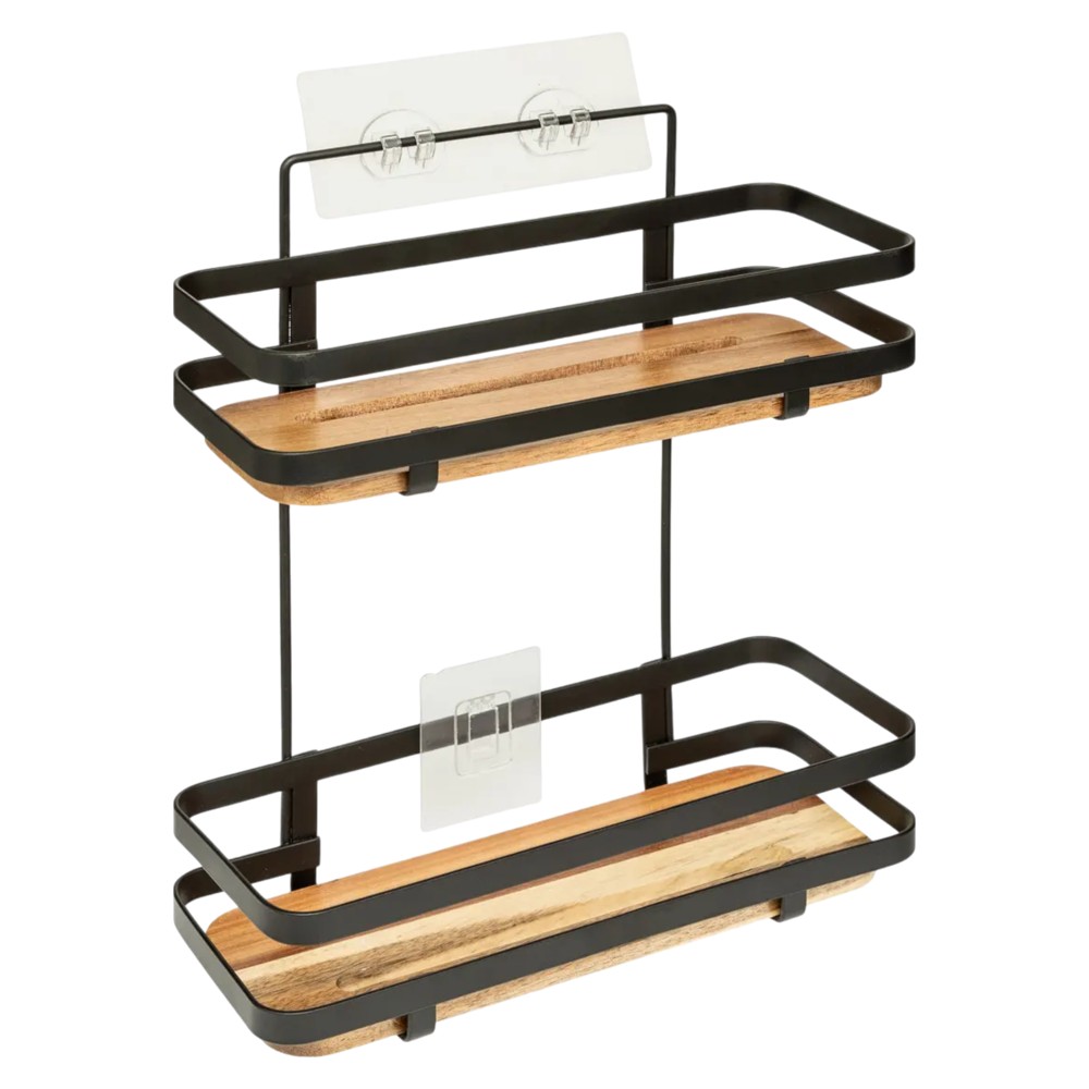 Shampoo holder rectangular shape 5FIVE "Blackacia" in steel and acacia wood color black and natural wood, 2 levels, Dimensions : H 30 cm x W 25.5 cm x D 15.5 cm