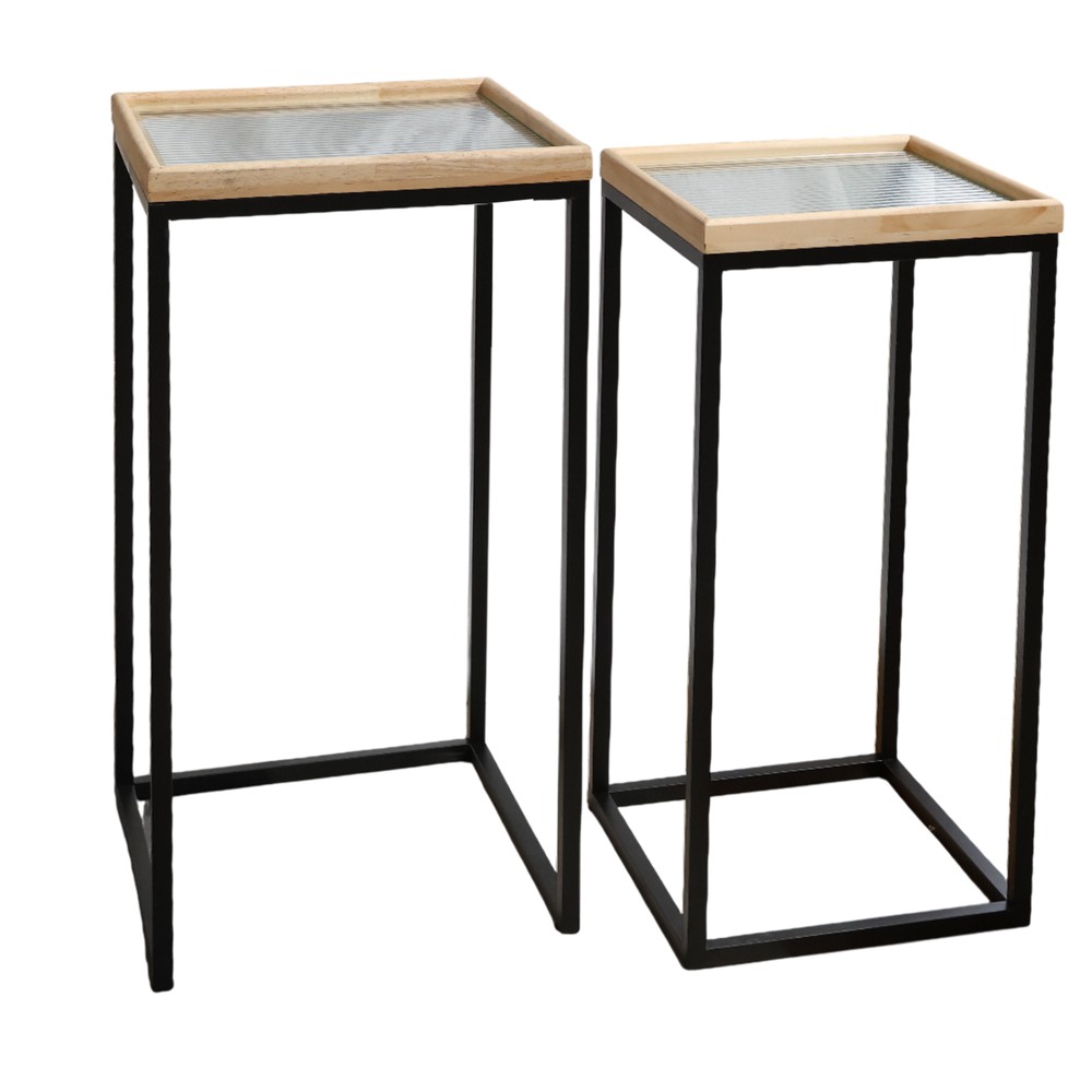 The ''Kanala'' table set with 2 sizes small and medium is the ideal solution for your environment. Ideal for decorating your environment but also practical. Manufactured in a metal structure, wooden frame and glass top in black and natural wood, it easily adapts to all types of furnishings.