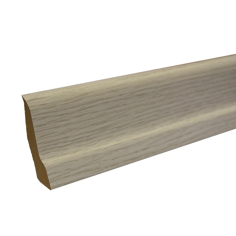 MDF skirting board perfectly covers the expansion joint of the floor. It is covered with wood-patterned foil and is secured with the mounting parts provided. Matching corners and edgings, skirting boards available.