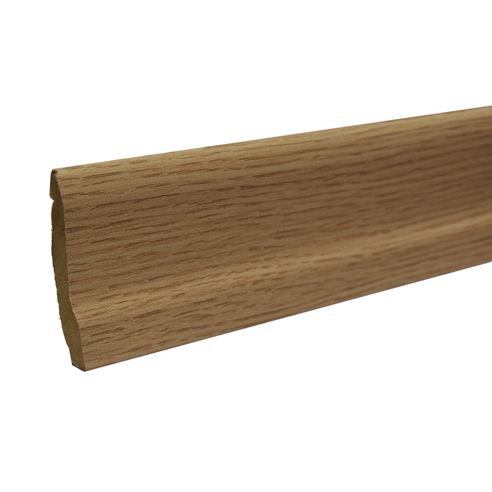 MDF skirting board perfectly covers the expansion joint of the floor. It is covered with wood-patterned foil and is secured with the mounting parts provided. Matching corners and edgings, skirting boards available.
