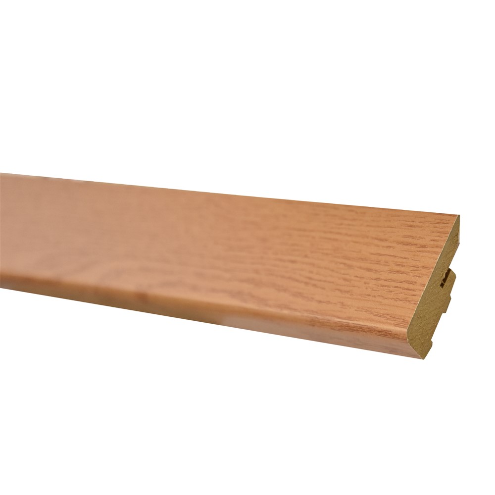 MDF skirting board perfectly covers the expansion joint of the floor. It is covered with wood-patterned foil and is secured with the mounting parts provided. Matching corners and edgings, skirting boards available.