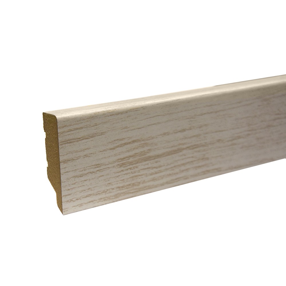 MDF skirting board perfectly covers the expansion joint of the floor. It is covered with wood-patterned foil and is secured with the mounting parts provided. Matching corners and edgings, skirting boards available.