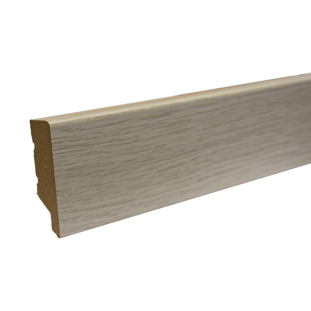 MDF skirting board perfectly covers the expansion joint of the floor. It is covered with wood-patterned foil and is secured with the mounting parts provided. Matching corners and edgings, skirting boards available.