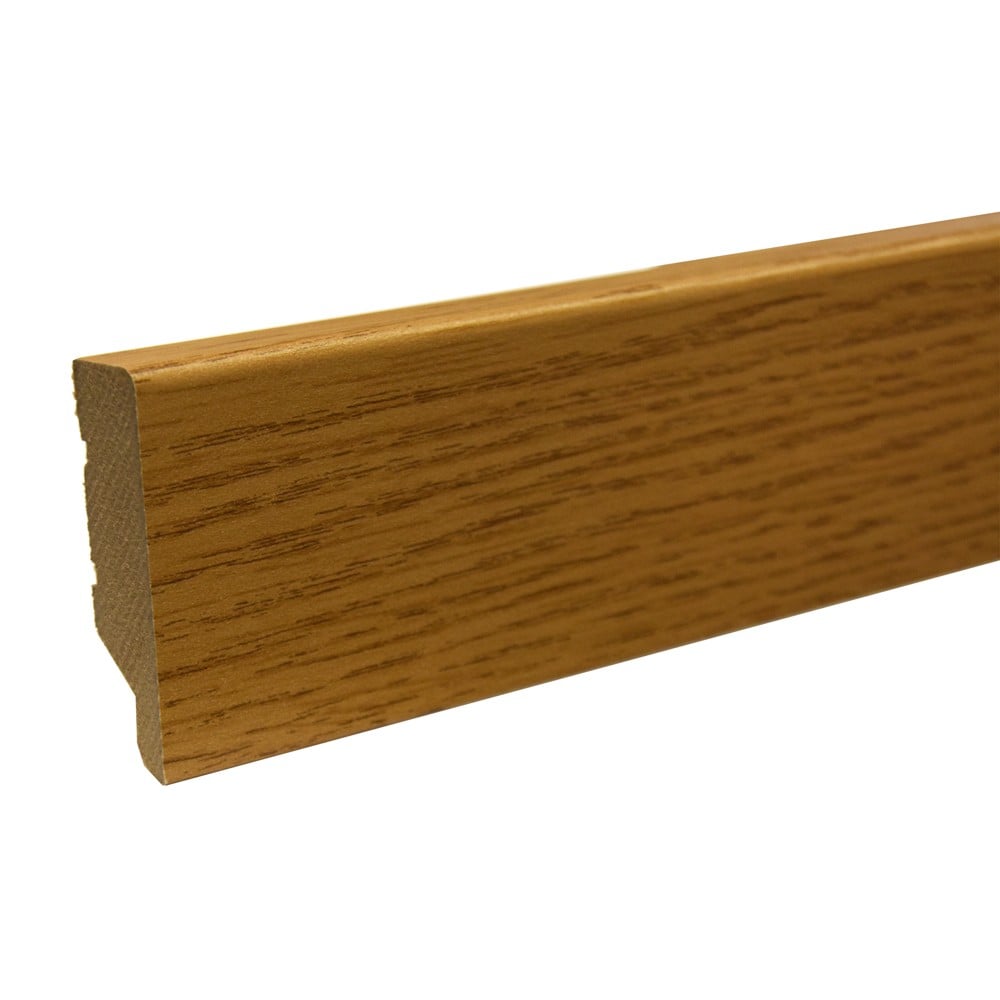 MDF skirting board perfectly covers the expansion joint of the floor. It is covered with wood-patterned foil and is secured with the mounting parts provided. Matching corners and edgings, skirting boards available.