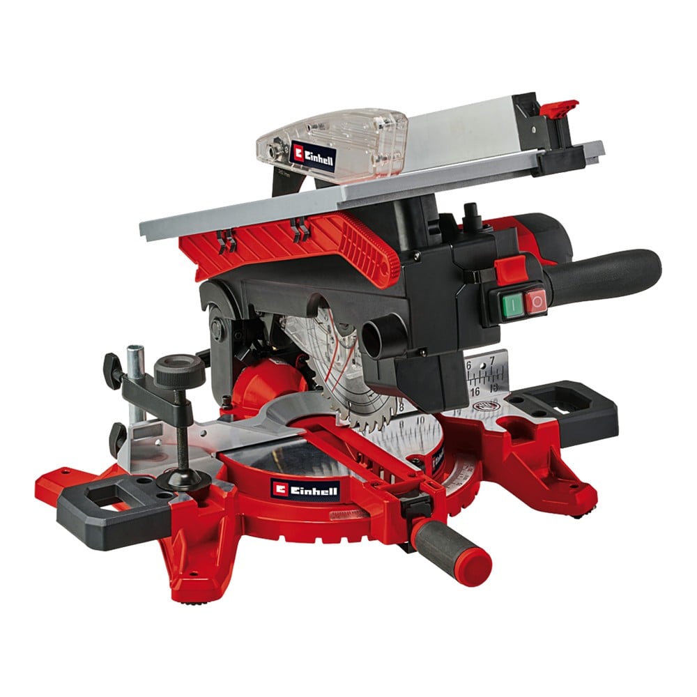 The Einhell cross-cut mitre saw with upper table TE-MS 216 T is a powerful and versatile working tool in the workshop or in the hobby basement. With an output of 1500 watts and an idle speed of 4500 rpm, it works powerfully and precisely through materials such as wood, coated panels or plastics. Clean and precise, the high-quality Ø 216 mm carbide tipped saw blade with its 36 teeth cuts through the workpieces at an angle of up to 45°. The maximum cutting depth at a setting of 90° x 90° (saw table x saw head) is 55 mm and the maximum cutting width is 120 mm. The cross-cut mitre saw can be easily and tool-free converted into a table circular saw and fixed. In this case, the adjustable rip fence ensures straight cuts. The rotary table can be adjusted as desired to the left and right at an angle of up to 45° – an angle scale helps with the optimal position. To achieve perfect mitre cuts, the saw head can be tilted up to 45° to the left. The cut is marked by an integrated cutting line laser. The device has workpiece supports on the left and right, so that even longer workpieces can be easily machined. The clamping device offers additional safety, with which the working materials can be fixed. The integrated Ø 36 mm suction connections, to which, for example, all Einhell wet-dry vacuum cleaners can be connected, ensure clean work.