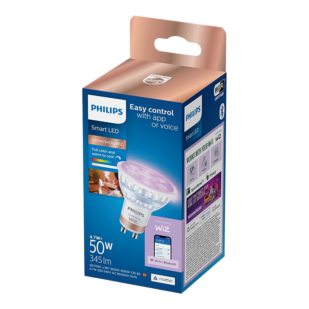 The Philips Smart LED Lamp GU10, 50W, offers 345 lumens of brightness and features an adjustable color temperature range from 2200K to 6500K, allowing you to customize the warmth or coolness of the light. It also supports RGB functionality, giving you the flexibility to change the color of the light to fit your mood or setting. With a lifespan of 15,000 hours, this energy-efficient lamp is designed for long-term use. It can be controlled through smart apps, making it ideal for personalized lighting in various indoor spaces.