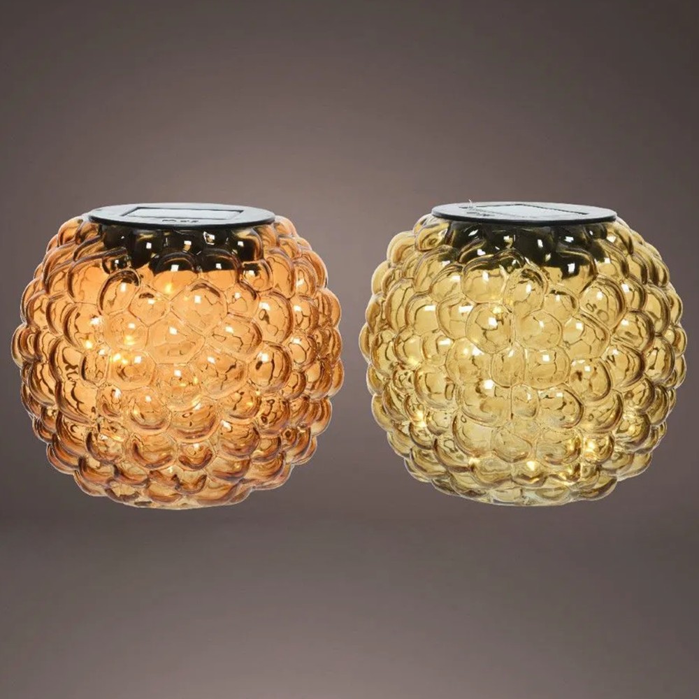 Solar panel table lamp, 21 cm diameter and 18 cm height, with gold design and transparent material. This lamp has an elegant and modern look, using solar energy to provide warm and atmospheric lighting, adding a luxurious and refined touch to any interior.