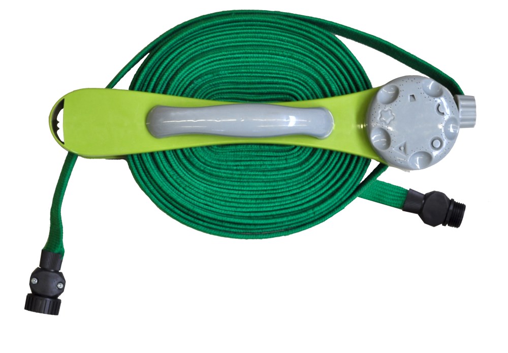 The incredible 15M FLAT HOSE wich rolls up to acompact case.With 5 FUNCTION SPRINKLER,ideal for campers,gardens,Decs and Patios