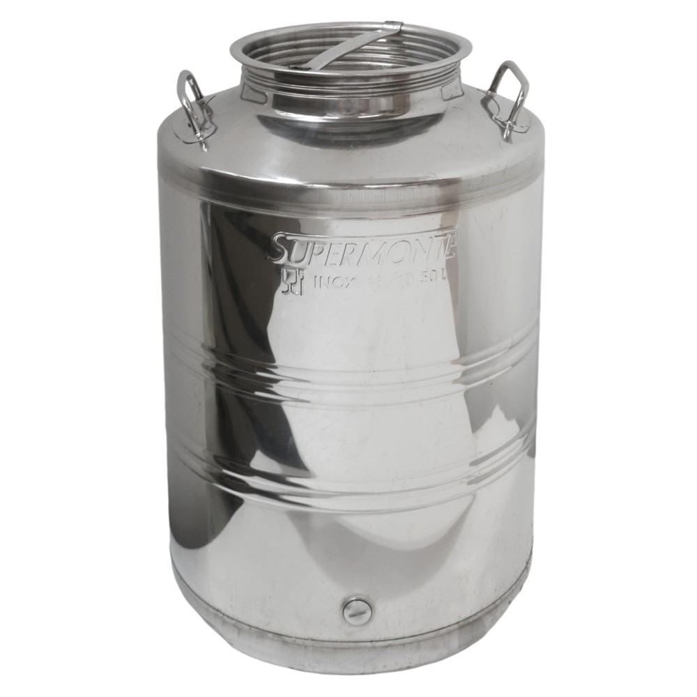 Stainless steel canister for oil, capacity 50 liters. Constructed of stainless steel material for durability and high strength, this canister is ideal for storing and transporting oils.