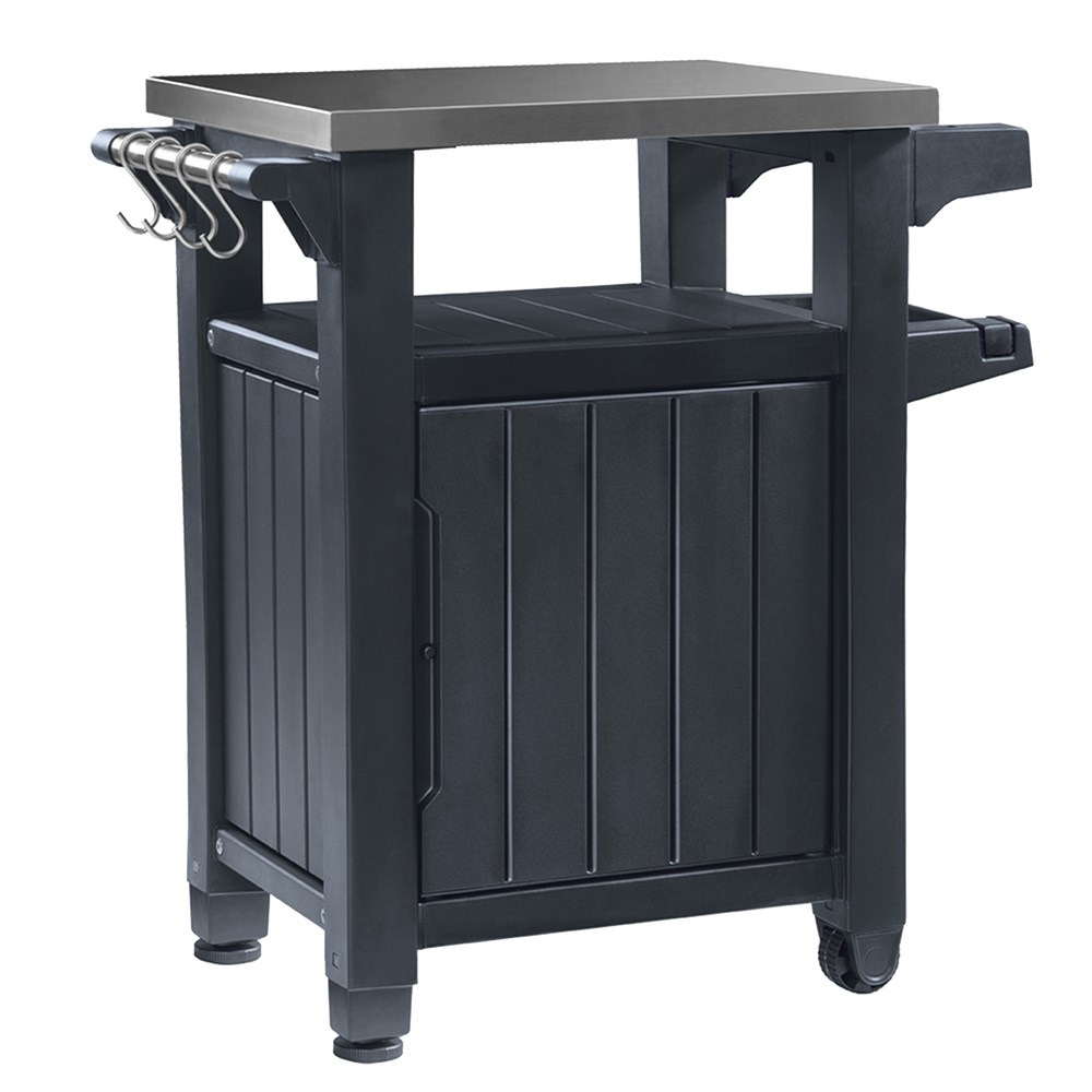 Stainless steel counter "Unity 93" with plastic base and folding. Made of metal structure with strong and weather resistant plastic, while the upper part is made of stainless steel. Suitable for food and beverage preparation. It has 2 integrated wheels to make transport easier, 2-spoke closet and space for hanging accessories. Ideal for organizing a "Barbecue", or an outdoor party ..