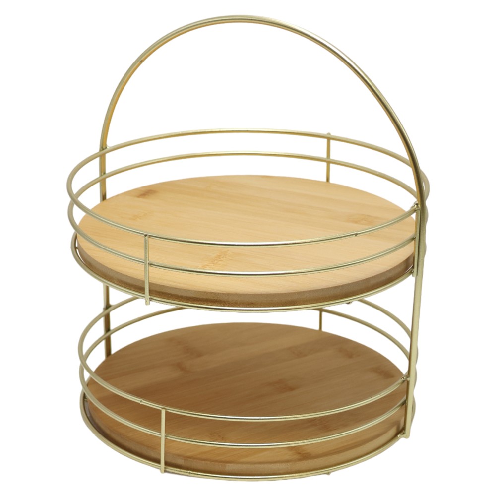 Elegant stand with two floors, made of natural brown bamboo, with a diameter of 26x26 cm. This stand offers a convenient choice for serving desserts or fruit in an organized manner.