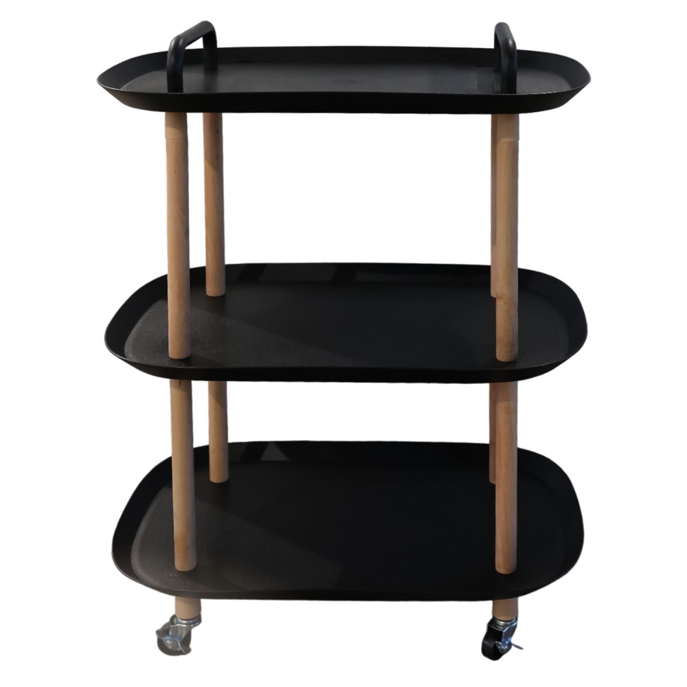 Plastic stand with three floors, in black color, with dimensions 36x56xH80 cm. This product offers enough space to organize products in a convenient way. Thanks to the 4 wheels at the bottom, it is easily transported where you need it.