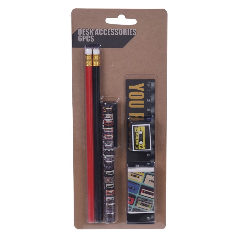A set of stationery accessories, which includes two graphite pencils equipped with erasers, a pen equipped with a cap and a pocket clip, a pencil sharpener with a 0.75 cm diameter socket, a pencil eraser and a plastic ruler, which measures up to 15 cm. The set is used for writing, for taking various notes or for making quick sketches, it has small and compact dimensions, which make it practical to use, and can be taken anywhere with it. This product is suitable for use in schools, universities, courses, stationery offices, etc.