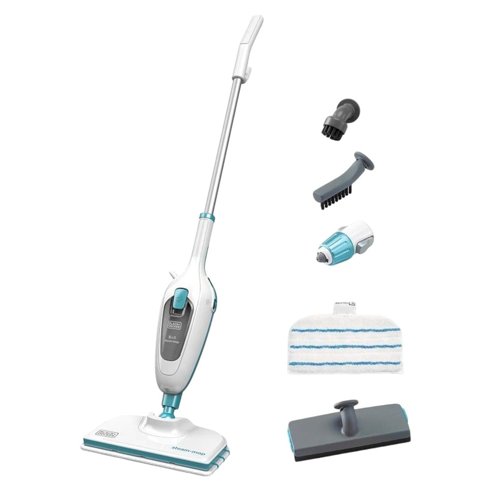 The BLACK+DECKER FSM13E5-QS steam mop is an innovative tool used for cleaning floors and various surfaces in your home. It is equipped with a motor using a nominal power of 1,300 Watts and generates a steam flow at 72 ° C to tackle all types of dirt. The power and consistency of the jets guarantee fast and efficient cleaning. In fact, the device can eliminate up to 99.9% of bacteria and other germs present on the floor. Thus, the device cleans, disinfects and sanitizes surfaces as it passes, and this exclusively thanks to the power of steam. The steam mop is therefore an ecological tool, because it does not require chemicals that can have harmful effects on the environment or the health of the user. In terms of handling the device, the weight of 2.3 kg ensures easy handling with one hand. The ergonomic handle provides stability and improves control of the steam mop. The appliance is powered by a 4.8-metre cable that provides great freedom of movement. Equipped with a 180° pivoting head, the mop allows you to reach hard-to-reach areas, under furniture or in corners of rooms in the house. The main cleaning accessory of the FSM13E5-QS is a microfibre pad that can be used on several types of hard surfaces. The microfibre floor pad can be easily removed with the foot using a tab and is machine washable, so it can be used many times, up to 100 cycles at a maximum temperature of 60°. The BLACK+DECKER FSM13E5-QS steam mop comes with 5 accessories.