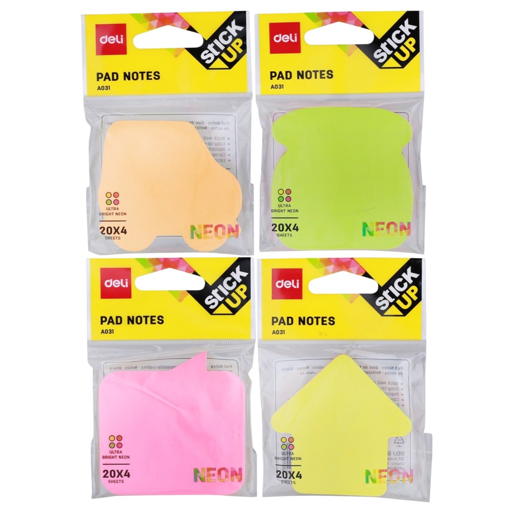 Set of 80 sticky notes from Deli, measuring 76 x 76 mm, in bright neon colors. The adhesive ensures that the notes stick to a variety of surfaces, making them ideal for quick notes, to-do lists and organizing information in the office, school or home.