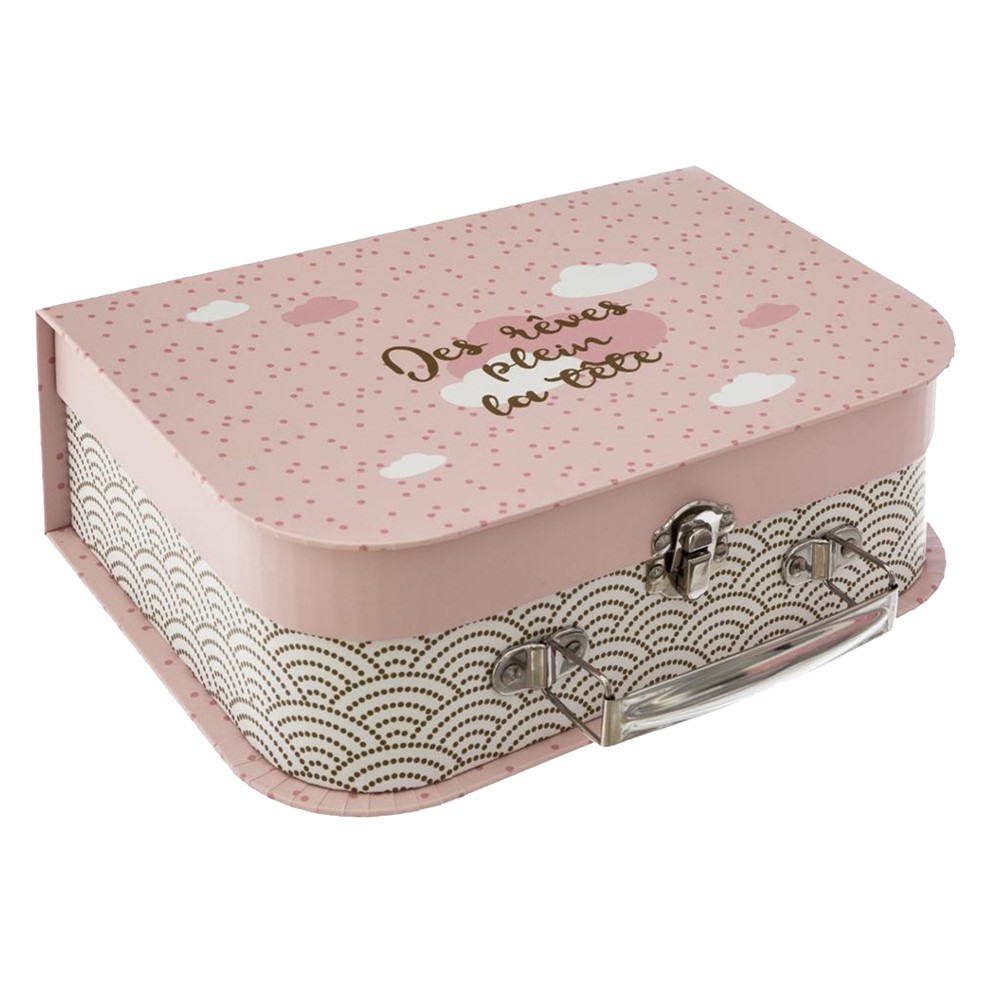 Storage box, which is made of strong cardboard material, in pink color with decorative prints, equipped with a handle made of metal material. The storage box can be used in home environments to organize jewelry, cosmetics, hair clips and other accessories, while managing limited spaces. This product is lightweight and practical to use, it has compact dimensions and it is convenient to take with you on trips.