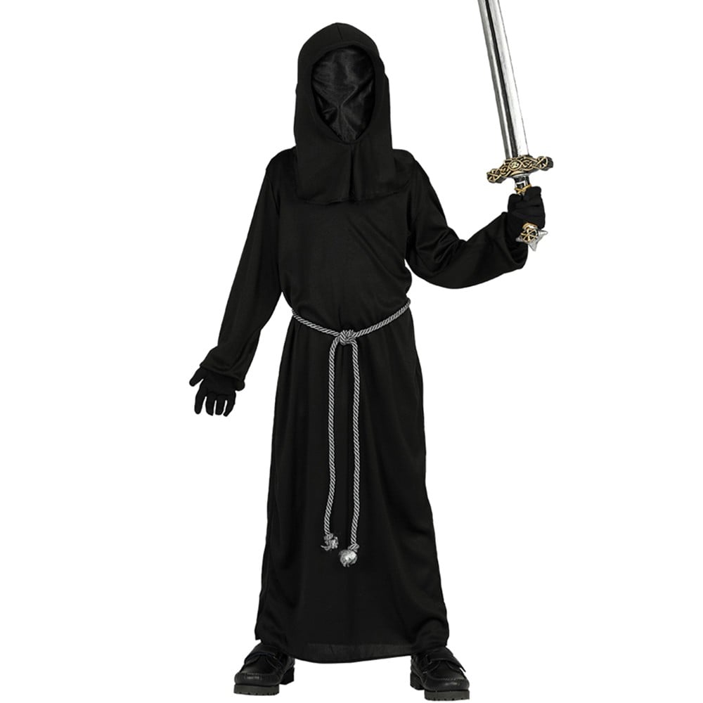 Children's suit made of polyester material, in black color. It is suitable for children aged 10-12 years. The package includes the black hooded cape and waist belt.