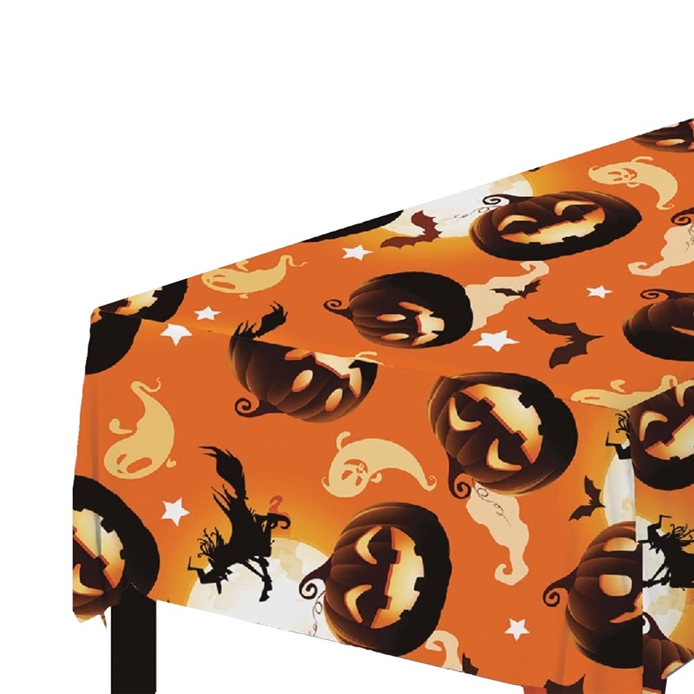 Table cover made of plastic material, with pumpkin design, size 137x274 cm. Ideal for table decoration for the Halloween party.