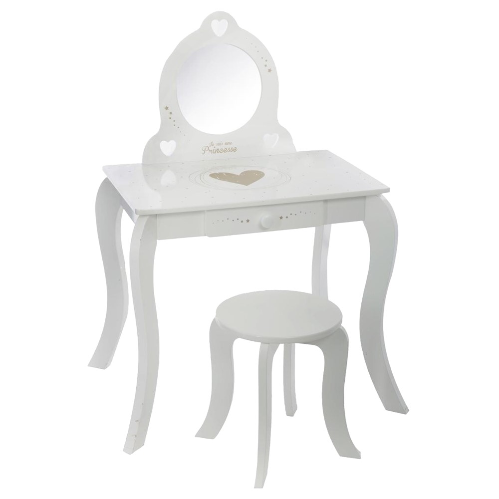 Desk and bench for children's room. The set is composed of a table with a mirror measuring 50.5x50.5x92 cm, with a mirrored drawer and a round bench measuring: 28x28x32 cm. The set is practical, easy to assemble. It consists of wood material in white color.