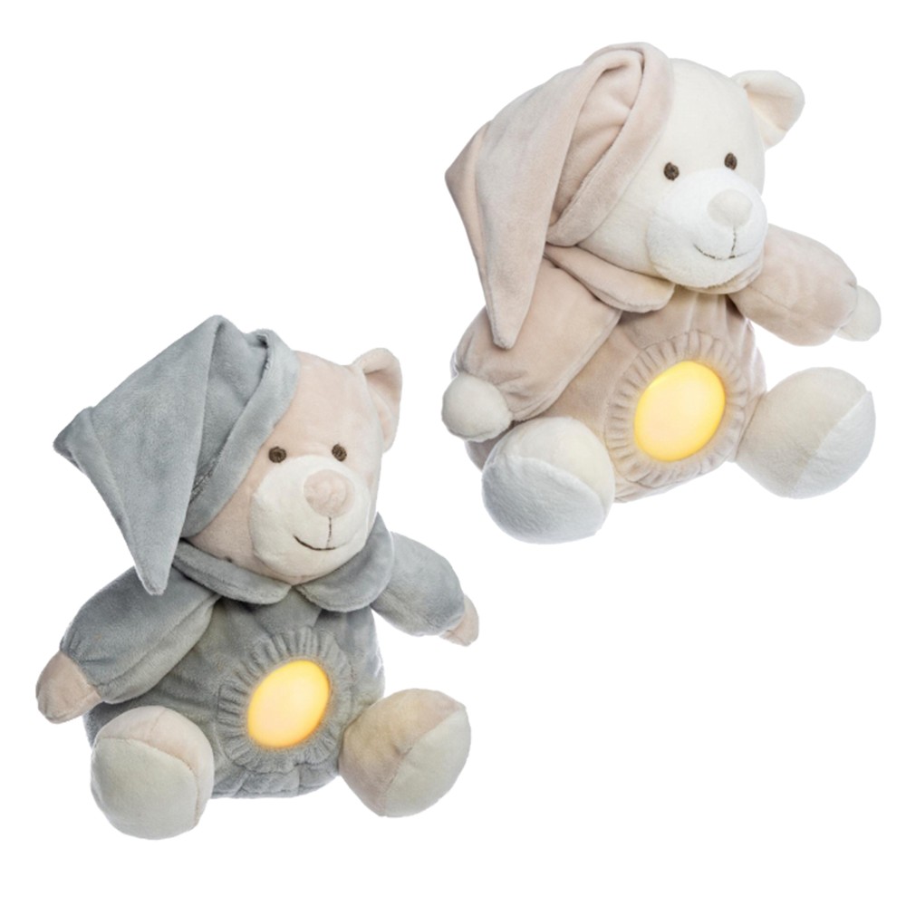 Bear lampshade for children's room, with lights made of plush material, and with plastic. In the belly part there is a plastic with light which works with 2xAAA batteries. It has dimensions of 20x12x20 cm, in beige and gray color.