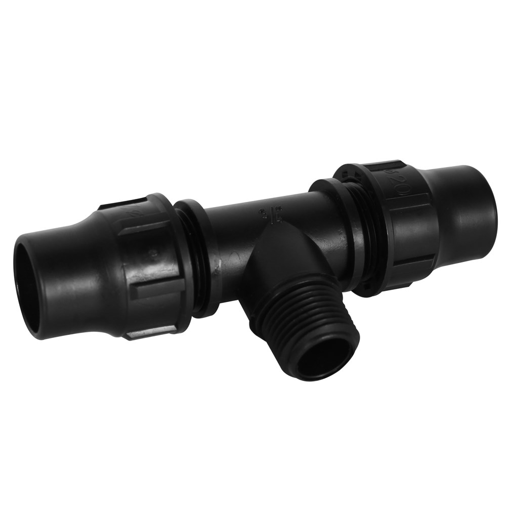 Tee with faucet of PE 20x1/2"x20 mm male with angle 90°. Used to installations angular water supply infrastructure lines, in irrigation and agricul, etc. This tee enables network branching 90° angle. This tee connect LDPE pipe Ø 20 with other fittings by fillet, for joining the fillet recommend tu use teflon whiles pipe connect whith tee in mechanically with faucet. Manufactured with European standards, resistant to corrosive materials designed to withstand pressure up to 6 Bar.