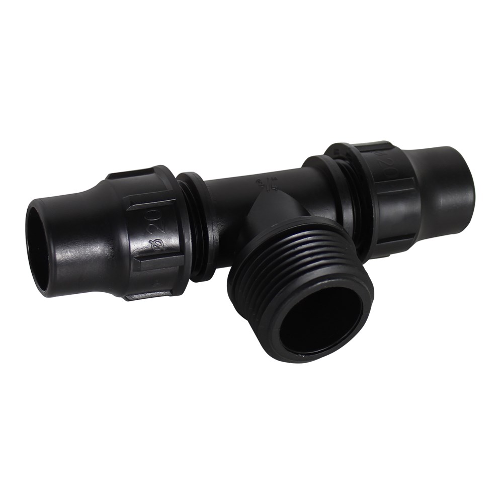 Tee with faucet of PE 20x1"x20 mm male with angle 90°. Used to installations angular water supply infrastructure lines, in irrigation and agricul, etc. This tee enables network branching 90° angle. This tee connect LDPE pipe Ø 20 with other fittings by fillet, for joining the fillet recommend tu use teflon whiles pipe connect whith tee in mechanically with faucet. Manufactured with European standards, resistant to corrosive materials designed to withstand pressure up to 6 Bar.