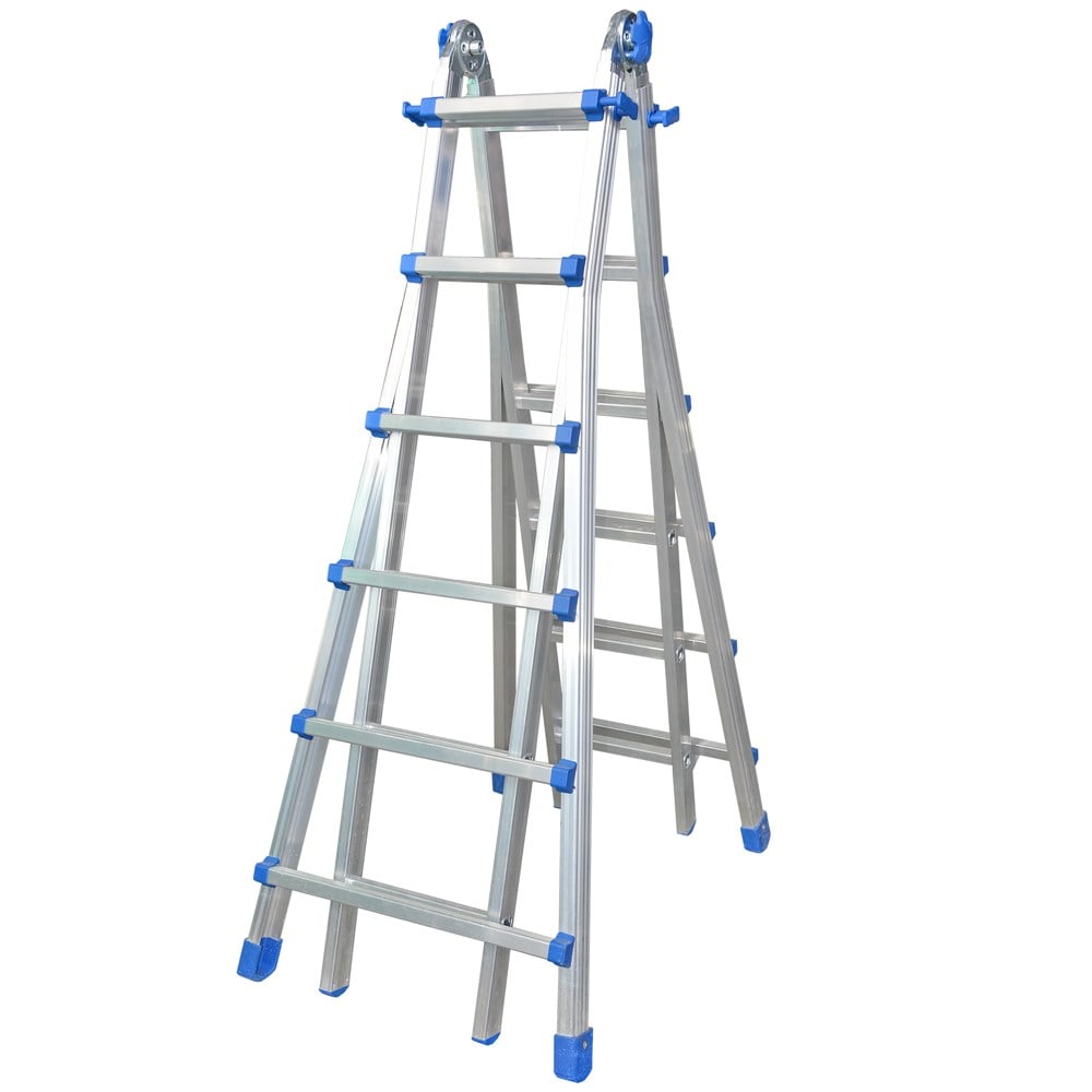 EQUIPE is a telescopic ladder in aluminium, can be used in extended, double or adjustable position.• UNI EN 131 tested and certified (model EQU33, EQU34 and EQU44), Load capacity kg 150• Pitch between rungs mm 280• Knurled anti-slip mm 30x30x1,5 rungs• Internal upright section mm 60×25• External upright section mm 68x33x2,8• Quick-set hinges• Nylon coated safety block hooks• Extra-strong ergonomic anti-slip rubber feet for best adherence to the ground• PATENTED galvanized steel hinge-handle with 3 steel pins• Shrink-wrap film packaging includes promotional poster and user and maintenance handbook