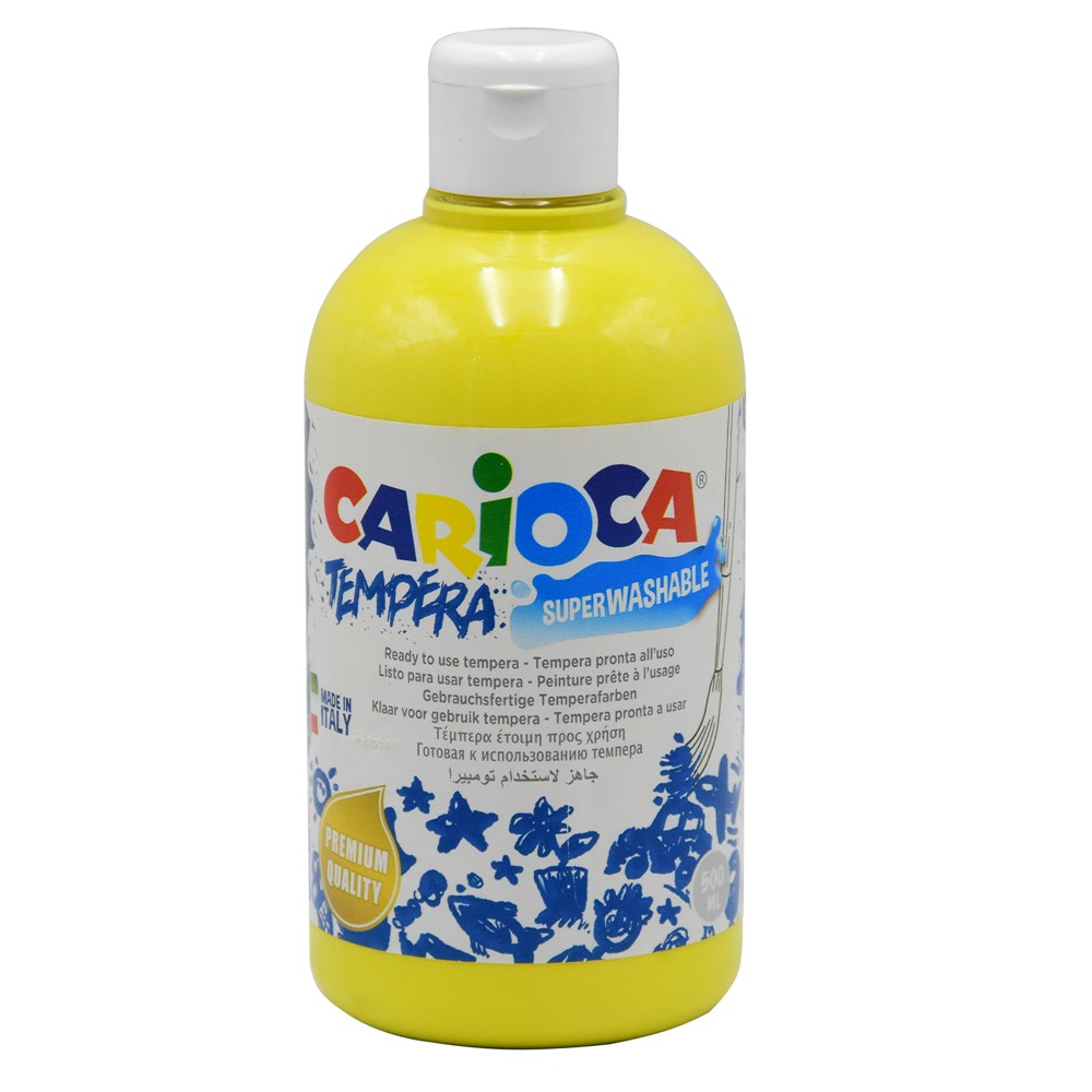Tempera paint for children, in 500 ml package made of plastic material, in yellow color, with non-toxic composition, which does not cause skin irritation. The paint is used by children in kindergartens and schools, for painting or for coloring other artworks, and it is suitable for application on canvas, cardboard or thick sheets of paper. This product is suitable for use by children over 3 years old.