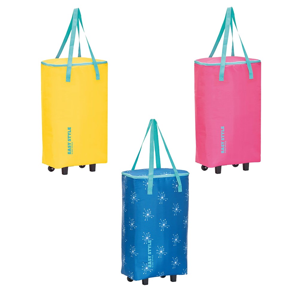 Thermal lunch trolley, made of polyester material equipped with a thermal coating of 4 mm polyethylene and aluminum, without PVC content, with dimensions of 33x20x63 cm and with a capacity of 44 liters. It can be used for packing and carrying various foods and it maintains food temperature for a long time.