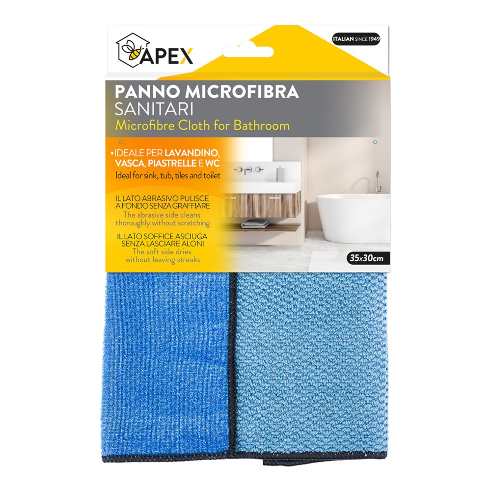 Special microfiber cloth for cleaning sanitary ware and taps. Ideal for bathtubs, sinks, tiles and toilets. The abrasive side cleans thoroughly without scratching. The soft top cleans and dries without leaving streaks. Dimensions 35 x 30 cm.