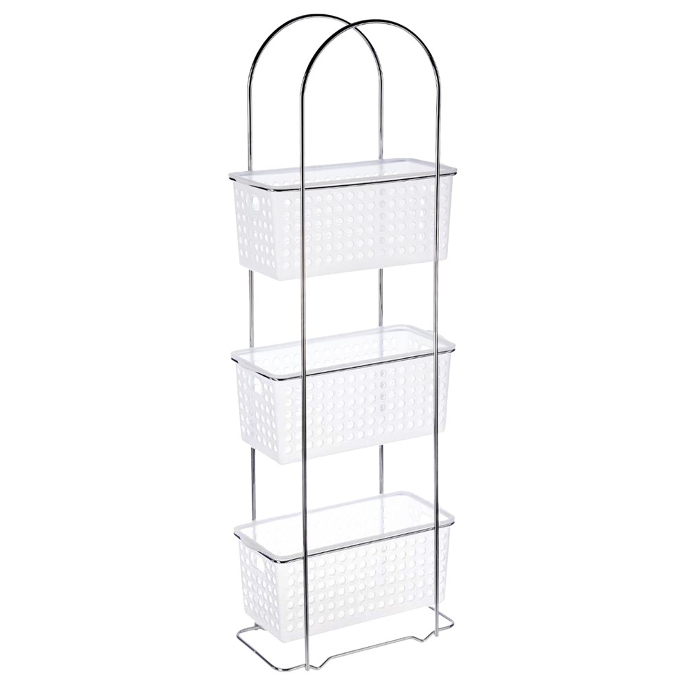 The shelf fits very well in the toilet, where you can store bathroom accessories, cosmetics, towels. There are 3 spacious shelves, like baskets. Ideal for rooms decorated in a modern style and haidressing. The backing is made of chrome steel, and the white baskets are made of plastic.