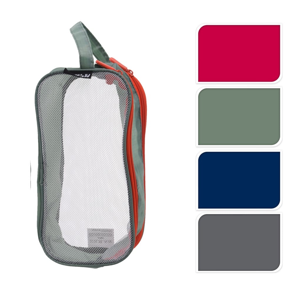 Travel organizer bag, made of polyester mesh material, in different colors, equipped with a large zippered compartment, with a side holder. It is used for storing and carrying personal hygiene products and various accessories, such as mobile phones, pens, cable chargers, power banks, notepads, etc., as well as for organizing them in travel bags. This product is lightweight and has compact dimensions, which make it convenient to take with you on trips.