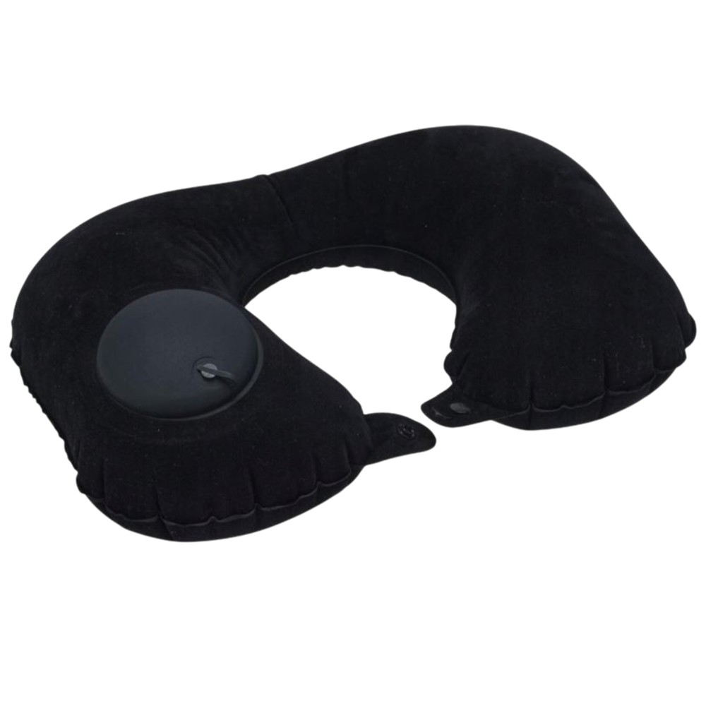 Inflatable travel pillow, in black, with dimensions 45x26 cm. Designed to provide you with support and comfort during travel, helping to relieve neck and head pain. Ideal for long trips by car, plane, or train.