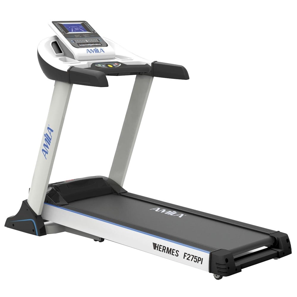 The Hermes F275PI fitness treadmill is one of the company's most reliable and robust treadmills with a 2.75HP engine, electronically adjustable incline in 15 levels, with a belt measuring 48x138cm, a shock absorption system with a special high-tech plate and the construction of the frame to allow maximum user weight 130 kg. One of the best treadmills in its class! Console with Multiple Functions The console of Hermes F275PI gives you absolute control over your corridor! It has an easy-to-read 7 LCD screen, with all the necessary information displayed such as, Time, Distance, Heart Rate, Calories, Speed, Incline, Body fat. Choose one of the 15 available programs and start your training. Increase and decrease speed and tilt quickly from the quick-change buttons on the console, and reach your limits.Leave small items, and your water bottle in the space next to the screen, so you have them within easy reach at all times.Its grips are comfortable from soft plastic. Belt - Floor The Hermes F275PI non-slip belt measuring 48x138cm combined with its quality construction allow you to train safely and without restriction in your movement! Its floor is 1.5 centimeters thick, while the thickness of the strap is 1.6 millimeters, offering special durability and comfort. Anti-Vibration System The anti-vibration system of the Hermes F275PI consists of a special plate design, high technology and materials, in the front for better shock absorption during exercise preventing injuries and strain on the joints. Folding System Like all AMILA treadmills, the Hermes F275PI has a folding system that allows you to fold it up for easy transport and storage. With the help of the hydraulic shock absorber, the treadmill is easily folded and locked in a vertical position to reduce the space it takes up. Build Quality - Motor The build quality of the Hermes F275PI makes it an ideal home treadmill choice thanks to its reliable 2.75HP motor, its rollers (48 front and 42 rear) as well as all its electronic parts with ideal dimensions. The construction materials of the frame are of high quality offering a maximum user weight of 130 kg.