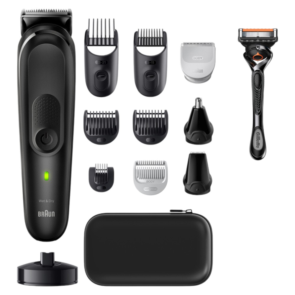 Braun All-In-One Series 7 MGK7460, 12 in 1 set for beard, hair, shaving and more. Grooming from head to toe with the Braun All-In-One Series 7 Styling Kit Beard, hair and shaving care kit. With a reliable metal blade, AutoSense technology and 100 minutes of runtime.Box contents:1 trimmer1 metal trimmer head1 body trimmer head1 precision trimmer head1 ear and nose trimmer head1 beard comb (3-11 mm)1 hair comb (13-21 mm)1 standard comb (1 mm)1 comb (2 mm)1 sensitive area comb1 eyebrow cap1 Gillette ProGlide razor1 Gillette ProGlide cartridge1 cleaning brush1 charging base1 storage case.