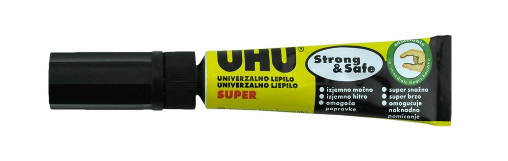 UHU All Purpose Adhesives Super Strong & Safe, the super strong and super fast adhesive- no instant finger bonding. Suitable for virtually all flexible, solid, porous and non-porous materials. Withstands vibrations and tremors. Moisture and heat resistant from -50°C to +100°C. Universal - glues porcelain, ceramic, many plastic materials, metal, wood, glass, leather, rubber, Styrofoam, paper, cardboard. Not suitable for leather clothing, textiles, PE and PP. Surfaces to be stuck together must be dry and free of dust and grease