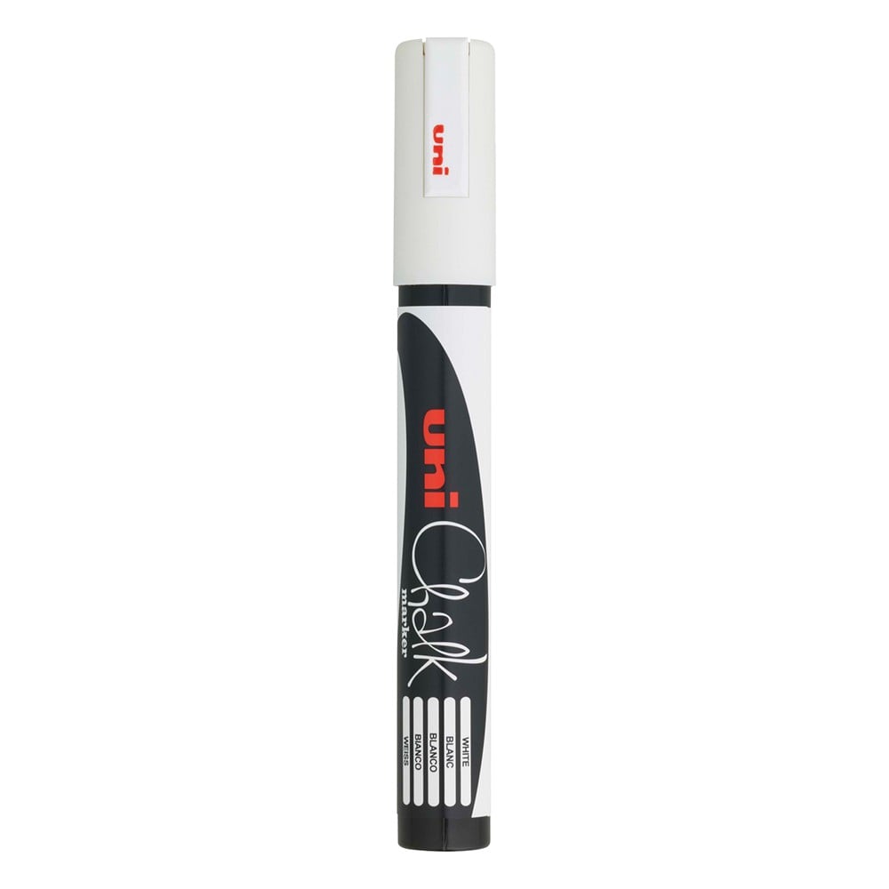 White Liquid Chalk Uni Marker. Writes on any non-porous surface (blackboard, glass, plastic, metal, wood, etc.). It is resistant to moisture and can be easily cleaned with a damp paper.