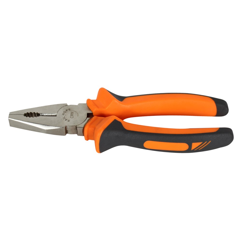 The 180mm pliers is made of drop forged Cr-V, tough and long service life. Cutting edge is specially heat-treated and the cutting angle is reasonably optimized, to ensure the perfect cutting power and precision. The pliers head is one side black finished, ne side polished. The 2-color handle is mixed by hard and soft material according to ergonomics, to offer you a comfotable felling.
