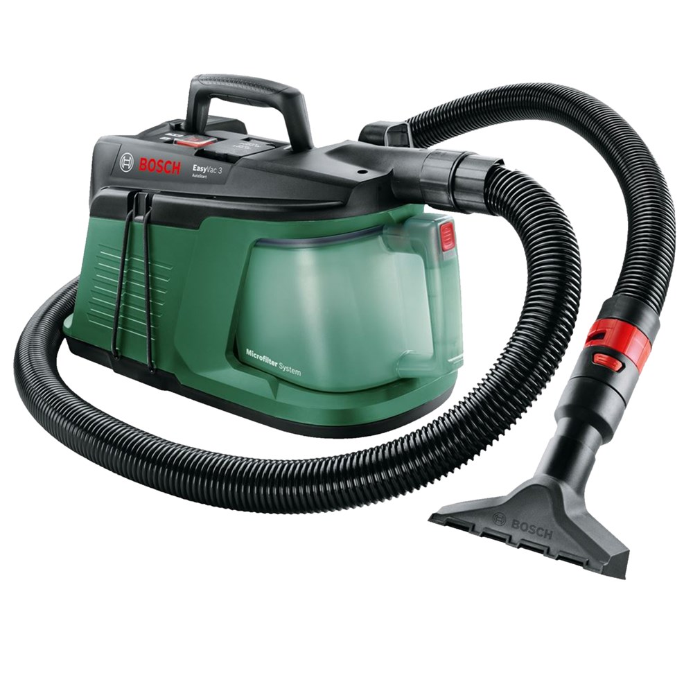 Space-saving storage of the vacuum cleaner thanks to the convenient attachment of hose and accessories. All the required accessories are stored directly on the vacuum cleaner and are therefore quickly to access at all times during extraction. Universal adapter facilitates direct dust extraction when working with all Bosch Home & Garden power tools. Other product advantages: Allows you to work flexibly even in hard-to-reach places thanks to the narrow crevice nozzle and 2.2 metre-long hose. Connecting power tools to the vacuum cleaner allows to have the vacuum cleaner be switched on and off automatically by operating the power tool. A comprehensive range of accessories facilitates a variety of applications and vacuuming of various materials