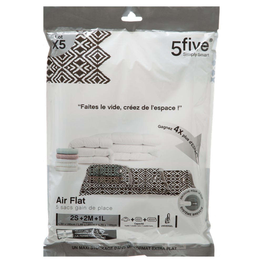 Vacuum packing bags are a practical storage and space-saving solution for both travel and home storage. The "Airflat" bag from 5FIVE Simply Smart saves you up to 4 times the space dedicated to storage. In polyethylene material, this packaging consists of bags of different sizes: 2 pieces S - Small, 2 pieces M - Medium, 1 piece L - Large and is equipped with a valve with closure. Dimensions, S - 50 x 60 cm, M - 60 x 80 cm, L - 70 x 120 cm.