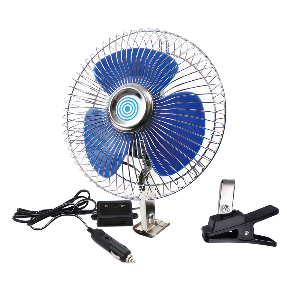 Large metal AMiO car fan powered by a 12V cigarette lighter. Mounting via a clip or screws.