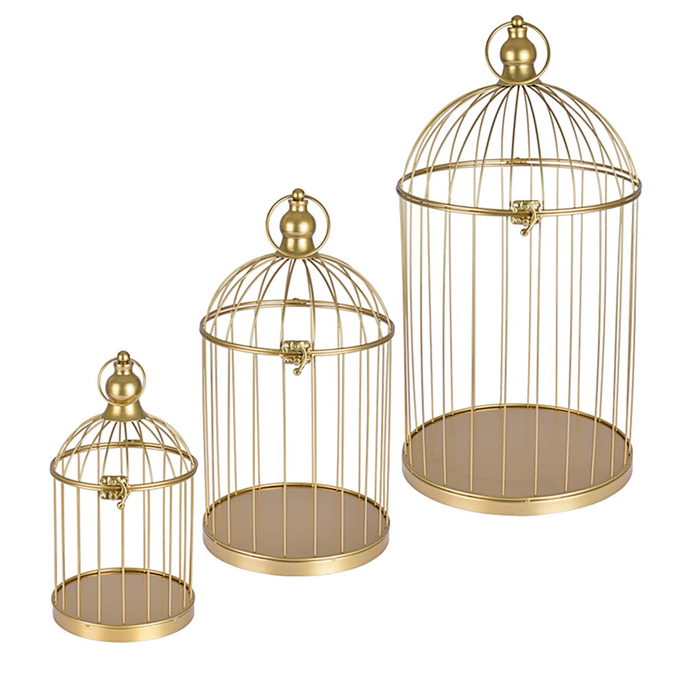 Set of cages made of metal material and gold color, original additions for any interior. These cages will not be a shelter for birds, as their design and functionality allow them to be decorative. Cages can be filled with climbing plants or decorative flowers. This set can also be used as original candlesticks. You can place them on the floor or you can hang them thanks to the useful handles.