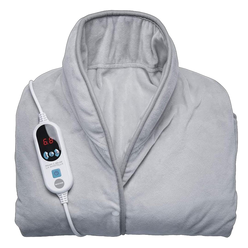 Soft thermal cape for back, neck and shoulders, microfiber fabric and press studs that create very comfortable sleeves. digital remote control with the possibility of choosing between 6 temperature levels. "Fast Heat" function that allows you to reach the desired temperature in a short time. programmable timer from 1 to 9 hours with automatic shutdown. Machine washable at low temperatures (max 30 ° C).